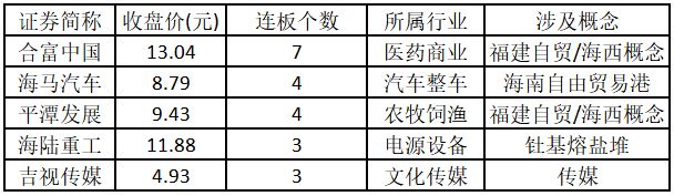 (注:封板资金越多的个股,说明该股被资金追捧,其延续上涨概率较大。) 从连板情况来看,今日首板个股有48只;2连板的个股有11只;3连板及以上的个股有8只。今日连板数排名前5的个股包括合富中国、海马汽车、平潭发展、海陆重工、吉视传媒,具体如下表所示。