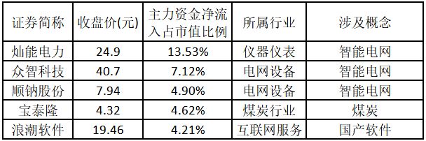 (注:主力资金净流入金额越多的涨停股,说明该股被主力资金重点关注,值得重点关注。) 主力资金净流入金额占市值比例排名前5的个股分别为灿能电力、众智科技、顺钠股份、宝泰隆、浪潮软件。