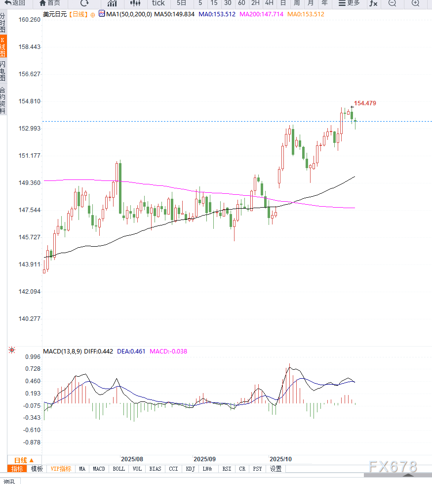 USD/JPY在亚洲交易时段延续跌势,交投于约153.50,连续第二个交易日下滑。日元近期受到全球避险情绪推动而走强。 ![]() 首相Sanae Takaichi表示,日本尚未实现由工资增长支撑的可持续通胀,暗示对进一步加息保持谨慎立场。政策发声增加了市场对日元支撑的信心,限制美元兑日元上行空间。 美元方面,在连续五日上涨后出现回落。美国政府财政停摆已进入第六周,有望成为历史上最长的停摆事件。参议院再次未通过共和党支持的短期拨款法案,这是第14次失败。 财政僵局增加了美元的不确定性,短线承压。 美联储政策仍对美元形成一定支撑。主席Jerome Powell在上周会议后表示,12月进一步降息仍存在不确定性,政策制定者可能采取观望态度,等待新官方数据发布。 整体来看,USD/JPY短期承压,但仍需关注全球风险情绪和政策动态对汇率的影响。 ![]() : USD/JPY近期走势呈现“日元避险支撑强势、美元受财政僵局拖累”的格局。全球风险资产回落及日本政策发声强化日元,下行压力明显;美元虽短线回落,但美联储政策谨慎态度提供一定底部支撑。 若全球风险情绪进一步升温或日本政策口风强化,USD/JPY可能继续下探;反之,美经济数据改善或美元重获支撑,则可能出现反弹,需密切关注宏观及政策动态。 |