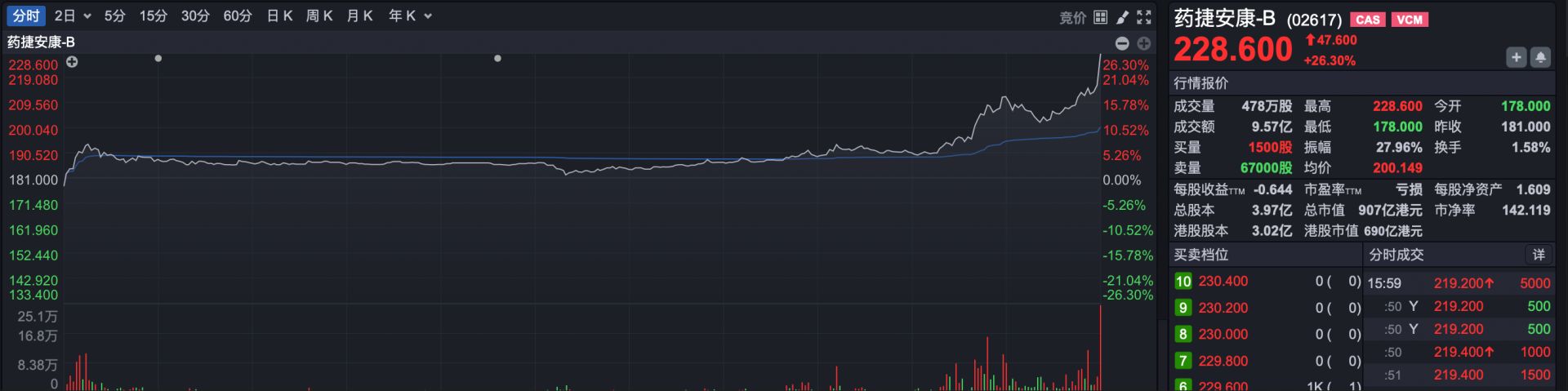 药捷安康-B(02617.HK)大涨26.3%。消息面上,药捷安康11月3日公告,Neurocrine与公司订立一项付特许权使用费的专利转让及研究合作协议,以开发NLRP3抑制剂,用于治疗多种疾病。根据该协议,Neurocrine获授予在大中华区以外开发、制造及商业化药捷安康NLRP3药物平台中的NLRP3抑制剂的独家权利。药捷安康将有权获得预付款,并可能根据Neurocrine的开发和商业化进展收到进一步里程碑付款,该协议的总潜在价值约为8.82亿美元。
