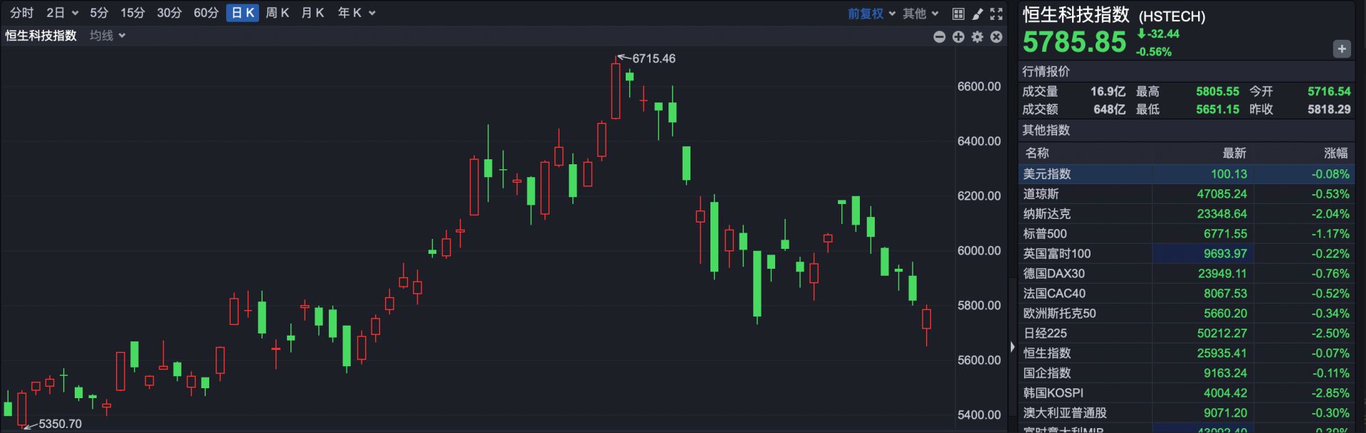 恒生科技指数报收于5785.85点,下跌32.44点,跌幅0.56%。