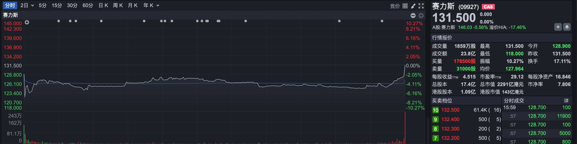 赛力斯(09927.HK)今日上市交易,早盘遭遇股价破发,但尾市显著回升,最终保住发行价131.5港元。