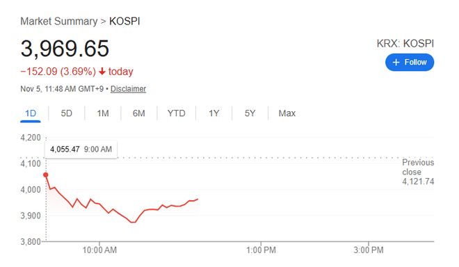 11:15更新: 韩国股市基准指数大跌,KOSPI指数一度下跌6%后跌幅有所收窄,截至发稿,KOSPI指数下跌3.69%。