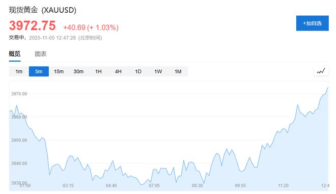 12:45更新: 现货黄金涨超1%,报3971美元。现货白银涨1.3%,报47.75美元。