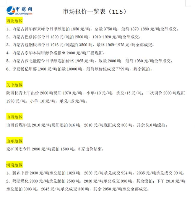 原标题:市场动态一览表(11.5) 每日提醒 来源:甲醇网