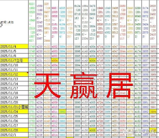 大盘已越过牛市下降压力线6124(20071016)—5178(20150612)并指向慢牛紫色趋势线1558(19930216)—2245(20010614)—3067所在4230一带。但是前几天到了2020年发表的《黄金分割是大自然的基本规律》中给出的4018黄金目标位进入小级别洗盘。 10月13日开始日线五浪上涨,与一浪对称的时间是11月12日,这次遇阻4018的洗盘,在30分钟K线图调整34跟K线的时间得到144线的支撑而反弹,并出现小时级别macd与kdj双金叉调入点,但还在5日均线与8日均线死叉点3981之下。所以要等站稳3981才确定日线级别调入点。但是上方趋势线密集区层层拦截(4003—4047),遇阻就回踩,然后再突破,于是上升速度自然放缓减速。 板块与风格在11月份前后有所变化,之前半年硬件和有色强者恒强的规律有所松动,近期出现进攻靠资源(有色钢铁),防守应用扩散:传媒娱乐、短剧游戏、知识付费、广播电视等AI应用端在11月季节性活跃,跷跷板“边洗边拉”。旧主线(硬件、有色)在五浪冲顶后有利润兑现的预期,要出货先拉高,所以硬件的惯性也有机会,只是不能追涨。 风险控制:依据《天赢居操作标准》:5日与8日均线死叉的个股,按规则减配;放量长上影且跌破21日线,视为阶段转弱,破位55日均线的个股不能叫洗盘而是出货。 一句话总结:这是日线五浪中的小洗盘:阻力簇令抬升放缓,守住上升通道下轨,上升趋势未变。