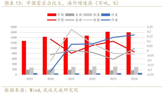 从供给端而言,当前受到“政策人为锁库”、“矿山源头减产”和“突发事故催化”三重供给压力形成的共同推动,这业使得需求增量的驱动极易引发价格显著抬升的原因。 03 需 求 铜价本轮上涨的叙事,除了“供给紧缩”的单引擎驱动,需求的显著增量也是主要原因,来自AI算力、全球能源设施重建及科技新兴领域的需求,正在构成结构性的长期需求增量,重塑铜市场的长期供需格局。全球精炼铜消费量2024年为2733万吨,其中2024年中国精炼铜总消费量 1595万吨(占全球消费量占比58.4%)。从主要分布来看,占比仍以中国需求为主,但高增速的期待来自海外。