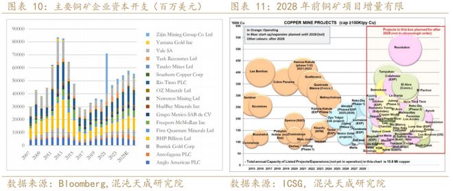 但从长期来看,历史资本开支不足;有矿山的品位下降、资源保护主义都导致供给端供给的释放缓慢,而需求带来的增量引发缺口压力,长期叙事仍不能改变。全球主要矿企的资本开支于2013年见顶,随后随着铜价回落而回落,并于2017年见底,此后尽管铜价在2021-2022年出现短暂的大幅上涨,但是近几年资本开支未出现明显上抬,与2000-2015年期间相比仍存在距离。资本开支的下降,铜矿品味的下滑,叠加上勘探成果低迷,长期的供应增量明显有限,根据ICSG的预测2028年之前,年产能超10万吨的大型增量项目明显有限。未来,新投运的大型项目将愈发稀缺,而现存项目亦存在品位下降、设施老化、营运风险上升的隐忧。