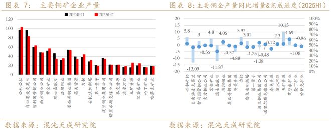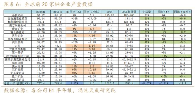 2.海外矿企产量的下修 海外矿企普遍下修产量,从长期角度显示供应瓶颈。 供给端的压力来自于矿山,矿石品位持续下降、关键项目投资不足、以及部分主要生产国(如智利、秘鲁)面临的运营许可和社区抗议等挑战使得全球主要铜矿企业接连发布产量下修指引。这些因素并非短期扰动,而是揭示了铜矿供应正面临结构性的长期瓶颈。矿端增长的持续乏力,意味着未来精炼铜的原料供应将长期处于紧平衡状态。 按照年初全年的企业产量指引2025年的矿端增量基本没有,前20家矿产企业的供应增量为-0.71%,其中自由港和波兰铜业均下滑约10万吨,嘉能可下滑约8万吨,伦丁矿业和英美资源下滑约5万吨。而从上半年的实际生产来看,2025年上半年铜产量增量主要由中国铜企提供,其中紫金矿产铜产量同比增长约9%,洛阳钼业产量同比增长13%,五矿资源同比增长约65%。这20家企业全年的生产指引约占原生铜整体产量的70%以上,按照2025H1的产量来看,前20家铜企业的产量平均增速约为4%,半年产量完成度较高,所以从实际的生产角度,除非下半年出现明显的产量下调事件,今年的供给尚不存在严重的短缺叙事。
