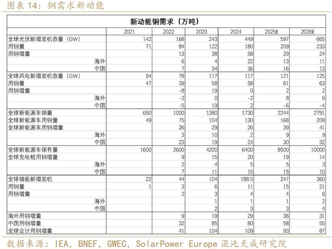 如果将铜需求进行新旧动能分类,旧动能(占比大):传统电力(18%),家电(12%)、建筑(26%)、传统交通(燃油车8%),机械电子(12%)、其他消费(3%),传统占比仍旧是铜需求的主要量;新动能(增速高):新能源光伏风电(9%)、新能源汽车(5%)、储能及充电桩(1%)、其他新兴领域(AI机器人6%),宏观叙事背后的主要增量来自于新动能,而旧动能仍以不失速作为基本假设。