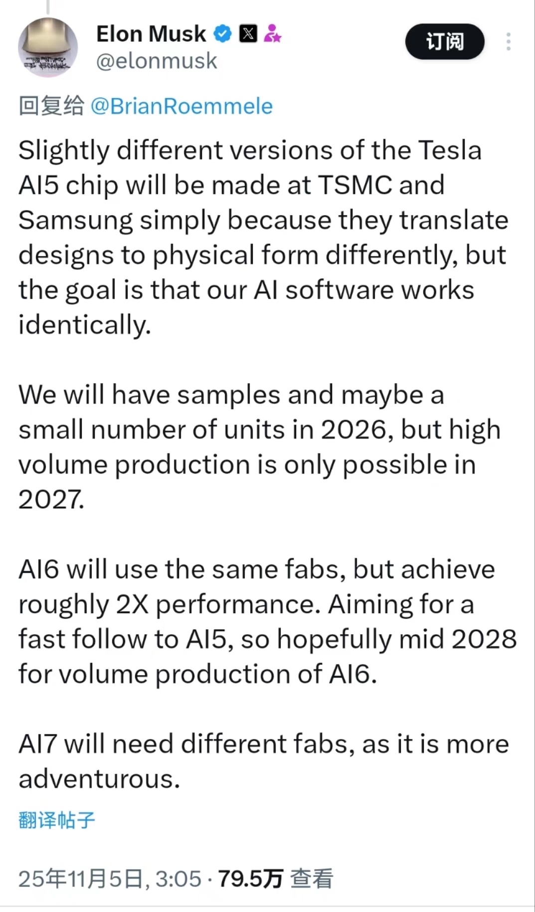 每经编辑|黄胜 11月5日消息,马斯克称,AI5芯片样品预计将于2026年推出,计划于2027年量产。AI6芯片将采用相同的晶圆厂,但性能将提升约2倍。 马斯克在社交媒体平台X上回应网友关于“Tesla AI5 芯片”的讨论时,首次披露了该系列芯片的生产计划与后续路线图。 马斯克明确表示,AI5芯片的大规模生产预计将在2027年完成,而AI6芯片则将在2028年推出。
