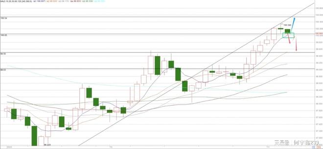 目前黄金已经是触及至4小时图上方的压制区域。 图中也可以看到,差不多3990附近就是重压位置,这里也是隔夜高点位置。 如果说再度破位上去,那么黄金可能就会触及至4000-4020高位。 反之,黄金接下来如果无法刷新站稳3990上方,那么后续可能会再度回撤下来。 首个重要支撑位置会在3965-70这里,跌破这里那么就会再度触及至3950低位。 其次就是美元这里: