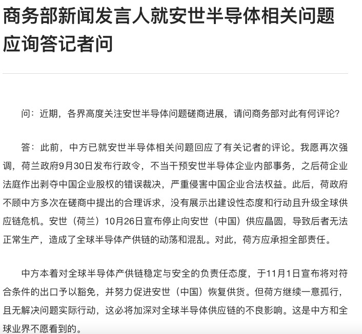 日前,有消息称,德国汽车零部件供应商正在紧急寻求中国对安世半导体芯片的出口限制豁免,希望通过政治解决方案,化解这一贸易僵局。