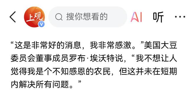这一消息传来之后,在芝加哥期货交易所的大豆期货价格一度触及近15个月来的最高水平,来自艾奥瓦州的农民帕姆·约翰逊说,我觉得无论怎么强调这件事情的重要性都不为过。我们已经等这天等的太久了,现在终于看到了一线希望。