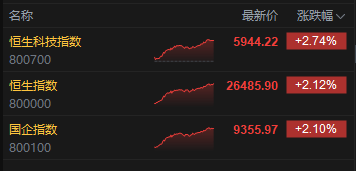 11月6日消息,港股三大指数高开高走。截至收盘,恒生指数涨2.12%,报26485.90点,恒生科技指数涨2.74%,国企指数涨2.10%。盘面上,科网股普涨,阿里巴巴涨超4%,京东涨超3%,快手、腾讯、美团涨超2%,哔哩哔哩涨2%,百度、网易涨超1%;半导体板块午后走强,华虹半导体涨超9%;有色金属板块强势,中国铝业涨超11%;苹果概念走高,蓝思科技涨超6%;今日港股4只新股上市,旺山旺水涨超145%。