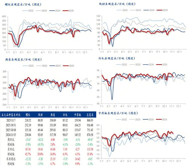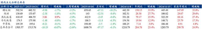 【本周回顾】 供应方面,本周五大钢材品种供应856.74吨,周环比下降18.55万吨,降幅2.1%。本周五大钢材品种产量周环比均有所下降,核心驱动在于,钢厂利润有所收缩,部分钢厂有所检修。库存方面,本周五大钢材总库存1503.57万吨,周环比降10.19万吨,降幅0.67%。本周五大品种总库存周环比有所下降:厂库周环比下降,降幅主要来自螺纹钢贡献。社库周环比下降,降幅同样主要来自螺纹钢贡献。消费方面,本周五大品种周消费量为866.93万吨,降5.4%;其中建材消费环比降7.2%,板材消费环比降0.2%。本周五大品种表观消费呈现建材板材双降局面,反映出市场需求有所承压的情况。 【下周展望】 供应方面,由于钢厂品种利润有所下滑,部分钢厂有所检修,本周五大品种产量小幅下降,另外山西部分钢厂也提出检修计划,增加后续供应收缩预期。需求方面,据百年建筑调研,截至11月4日,样本建筑工地资金到位率为59.82%,周环比上升0.12个百分点,其中,非房建项目资金到位率为61.22%,周环比上升0.07个百分点,房建项目资金到位率为53.19%,周环比上升0.37个百分点,五大材表需处于今年来低位水平,需求情况承压。库存表现有所分化,呈现螺纹总库下降而热卷总库增加的趋势,反映出热卷的供需压力有所加大,而五大材库存处于近年来高位,库存压力仍存。综合来看,成材需求进入淡季,后续回升压力有所加大,整体表现供需双弱,而宏观情绪暂时有所衰退,预计短期黑色系价格震荡运行。 【重要关注】 1、天气:预计未来一周,冷空气势力增强,14日至19日较强冷空气将自西向东影响我国大部地区,华西至黄淮等地将持续连阴雨天气,降水量较常年同期偏多5~8成,部分地区偏多1倍以上。20日之后,华西至黄淮等地降雨强度较前期明显减弱。预计14日至19日,有较强冷空气自西向东影响我国,其中,14日至15日影响新疆北部、甘肃西部、内蒙古西部等地,16日至19日影响中东部大部地区;上述地区气温普遍下降4~8℃,内蒙古中西部、华北北部、东北地区南部等地气温下降10℃以上,并伴有4~6级偏北风,阵风7~9级。 2、宏观:中美关系呈现“有限缓和”态势,APEC会晤在农产品采购、关税延期等方面取得进展。虽然未触及台湾、稀土等核心议题,但为国内政策转向创造了有利条件。这种“可控竞争”状态使政策重心得以从短期稳增长转向长期结构改革。通缩环境成为中美经济的特殊粘合剂。中国PPI持续通缩意外成为“隐性通胀缓冲器”。这种机制为美联储降息提供空间,也可能推动关税谈判阶段性缓和。反内卷政策注重资源优化配置,优先关注三类行业:产能过剩率高、价格战烈度强、全球产业链地位关键。与传统认知不同,政策强调“不存在大范围、结构性的产能过剩”,更倾向于市场化、法治化手段。 3、水泥&混凝土:10月29日-11月4日,本周全国水泥出库量284.9万吨,环比上升0.8%,同比下降17.42%;基建水泥直供量168万吨,环比上升0.6%,同比下降12.5%;10月29日-11月4日,百年建筑调研国内506家混凝土搅拌站产能利用率为7.78%,周环比下降0.20个百分点;同比提升0.77个百分点。506家混凝土搅拌站发运量为155.84万方,周环比减少2.48%,同比增加11.06%。 据Mysteel统计,螺纹方面,本周螺纹钢产量小幅减少,累计减少4.05万吨。分区域看,除华东、西南区域外,其余区域产量均呈现下降态势。分省份来看,河北、山西、黑龙江减量靠前,减产的原因是部分钢厂螺纹钢轧机停产检修及铁水转移至其他品种。安徽因个别钢厂复产,螺纹钢产量呈增加态势;线盘方面,本周线盘产量小幅减少,合计降幅3.34万吨。分区域来看,减量主要集中在东北和华东地区,供给分别减少1.11、0.99万吨,其他区域产量普遍小幅调整;分省份来看,安徽以及吉林省降幅靠前,周产量分别减少1、0.95万吨,其他区域产量都以小幅波动为主;热卷方面,本周产量下降,周环比下降5.4万吨,本周华北区域新增一家钢厂检修,无其他新增检修,目前产量仍处于高供给状态。 据Mysteel统计,螺纹方面,本周螺纹钢厂库存继续下降,累计减少4.87万吨。分区域看,除中南、华北区域库存微增外,其余区域库存均呈现下降态势;分省份看,广东库存减量靠前;线盘方面,本周厂库小幅减少,合计降幅2.05万吨。分区域来看,华北区域降幅靠前,库存下降1.47万吨,其他区域都有不同程度的波动;分省份来看,山西以及云南库存降幅位于前列,周分别减少1.37、0.93万吨;热卷方面,厂内库小幅减少,主要集中在华东、华北区域,近期市场价格基本处于弱势震荡阶段,高供给低需求情况持续,价格或将继续弱势运行。 据Mysteel统计,建材方面,以螺纹钢为例,从三大区域来看,华东累库4.21万吨,南方、北方周环比分别去库6.36万吨、2.96万吨;从七大区域来看,除华东、西北外,其他区域均呈现去库状态。热卷方面,从三大区域来看,华东、南方周环比分别累库4.20万吨、0.73万吨,北方周环比去库0.84万吨;从七大区域来看,除华东、西南外,其他区域均呈现去库状态。