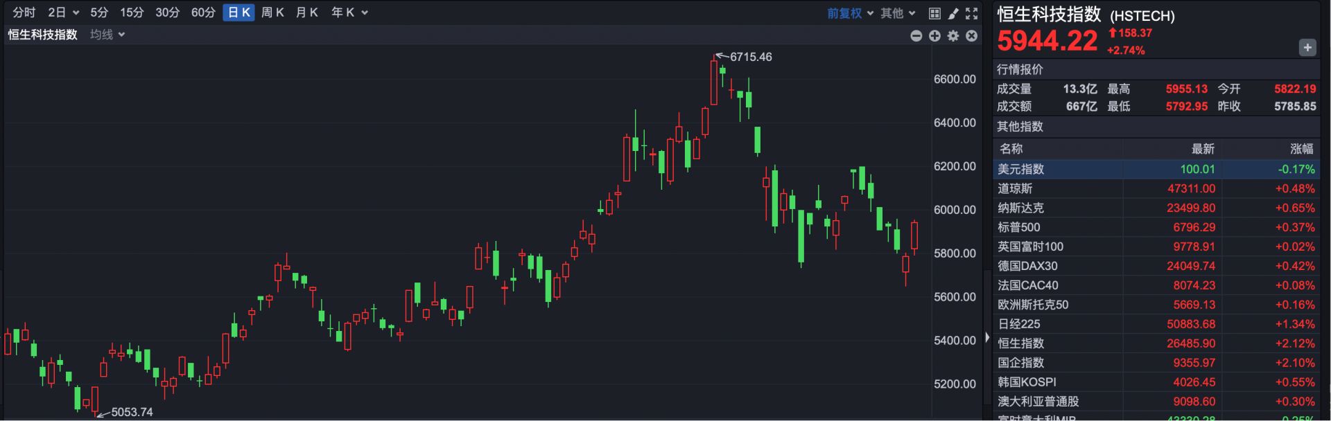 恒生科技指数报收于5944.22点,上涨158.37点,涨幅2.74%。