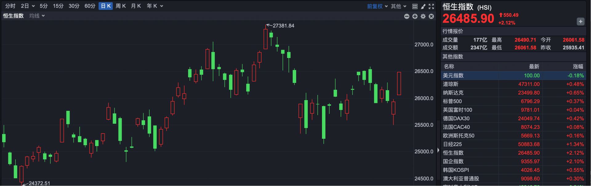 每经记者|曾子建 每经编辑|袁东 今日(11月6日),港股市场迎来强劲反弹。 截至收盘,恒指报收于26485.90点,上涨550.49点,涨幅2.12%。