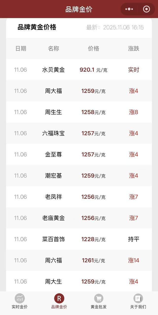 周大福、老凤祥、老庙等主流金店的足金饰品挂牌价从11月3日起就开始集体上调,11月3日单日涨幅超过5%,到11月6日,各头部品牌金饰价格均突破1250元/克,即便优惠过后最低也达到了1105元/克。 在一家品牌金店内,张女士本打算为母亲选购一支镯子,但看了价格之后,有些犹豫,“这两天金价没怎么涨,金饰突然贵了这么多,原本计划好的预算有点紧张了。” 刘女士今年升级当了妈妈,打算给孩子买个金锁,“看了好几家,价格确实有些贵,好看些的款式手工费也不便宜。”