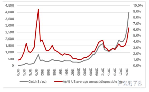金价年度涨幅亮眼,回调不改长期趋势 “那些仍将黄金视作野蛮的遗迹、一块无任何收益的无用金属,甚至认为持有黄金的持有成本高达4%(源于现金利息收益的损失)的怀疑论者,在金价从上月历史高点回落时或许会暗自认同,但这一轮回调未必意味着涨势终结。 1971-1980年及2001-2010年的两次牛市中,均出现过多次回调,但这些回调最终并未逆转或阻碍金价的大幅涨幅。” 但值得注意的是历史无法代表未来,所谓长期趋势可能是5年也可能是10年。 当前核心驱动因素:债务、通胀与地缘风险共振 “激增的政府债务与利息支出,让黄金多头认为零利率政策与量化宽松或许会再度纳入各国央行的政策工具箱,尤其是部分央行如今出于政治、经济或金融层面的考量,似乎不再像以往那样愿意持有美国国债及美元资产,”他写道。 “若不断攀升的债务、粘性通胀、地缘冲突,以及央行与货币当局面临的政治和财政政策压力,均在本轮黄金上涨中发挥作用,那么合理推测是,投资者至少会等到其中部分风险消退后,才会再次远离黄金——尽管这一天迟早会到来。” 峰值判断指标:黄金的可负担性阈值 他指出“1971年8月尼克松总统让美国脱离金本位制并瓦解布雷顿森林货币体系之前,一盎司黄金仅相当于美国普通家庭年可支配收入的不到1%”。 “在上世纪70年代黄金大牛市末期的1980年末,这一比例峰值超过9%。” “从这一维度来看,当前近6.5%的比例表明,黄金价格或许仍有上行空间,尤其是若通胀开始回升,并通过加薪或资产价格上涨带动收入增长的话。” 但从图中可以看出,金价的增速可以说是首次上穿了可支配收入增速,并且走出了斜率陡峭的加速度,也可以说是史上首次,这是非常值得警惕的事情 【免责声明】本文仅代表作者本人观点,与汇通财经无关。汇通财经对文中陈述、观点判断保持中立,不对所包含内容的准确性、可靠性或完整性提供任何明示或暗示的保证,且不构成任何投资建议,请读者仅作参考,并自行承担全部风险与责任。 |