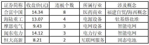 (注:封板资金越多的个股,说明该股被资金追捧,其延续上涨概率较大。) 从连板情况来看,今日首板个股有51只;2连板的个股有7只;3连板及以上的个股有4只。今日连板数排名前5的个股包括合富中国、海陆重工、摩恩电气、闽东电力、恒大高新,具体如下表所示。