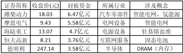 (注:主力资金净流入金额占市值比例越高的个股,说明该股被主力资金重点关注,值得重点关注。) 从封板资金来看,今日涨停板个股中,封板资金排名前5的个股包括潍柴动力、摩恩电气、海陆重工、恒大高新、德明利。欢迎大家关注微信公众号“道达号”,其“道达涨停复盘”栏目为大家解读。