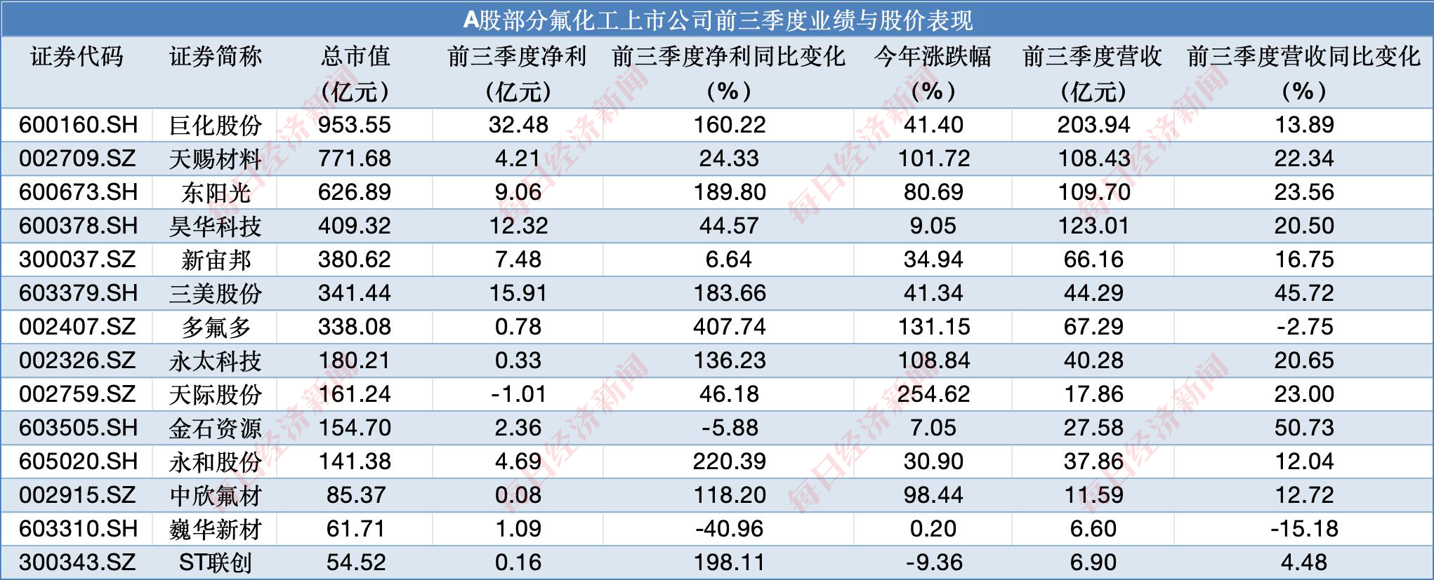 每经记者|黄宗彦 每经编辑|吴永久 A股三季报披露收官,氟化工板块在龙头企业带领下迎来“业绩与股价齐飞”的高景气周期。 每经资本眼专栏记者注意到,多氟多、永和股份、ST联创等多家公司前三季度净利润同比增幅超190%,其中多氟多以407.74%的增速领跑;巨化股份营收突破200亿元稳居规模榜首。 与此同时,业绩爆发直接带动股价走强,多氟多年内涨幅超130%,东阳光、巨化股份等头部企业均实现40%以上涨幅,呈现显著的“戴维斯双击”效应。 据了解,此次行业高景气核心源于六氟磷酸锂与制冷剂两大产品价格大幅上涨:六氟磷酸锂自7月起持续攀升至10.75万元/吨的近两年新高,制冷剂则受益于供给收缩与需求增长维持强势。 不过,板块内也出现分化,金石资源因技改导致产能释放不足出现净利润同比下滑,ST联创则受信披违规“戴帽”影响,虽业绩大增却股价背离。 对于景气度延续,接受记者采访的相关上市公司及业内人士普遍保持乐观,但也有部分上市公司提示上述两个产品的价格将在保持上涨的同时达到理性水平。 业绩与股价齐飞,头部公司开启氟化工高景气周期随着A股三季度报告日期截止,A股氟化工板块在龙头企业带领下,普遍交付亮眼的成绩单。 据每经资本眼专栏记者不完全统计,氟化工板块多数上市公司实现净利润大幅增长:多氟多前三季度净利同比飙升407.74%,永和股份、ST联创净利增速也分别达到220.39%、198.11%;东阳光、三美股份净利同比增幅均超180%。 营业收入方面整体稳中有升:金石资源、三美股份、东阳光营收同比增长排TOP3,分别为50.73%、45.72%及23.56%。营收规模突破百亿元的公司有4家,其中巨化股份以203.94亿元排名第一。