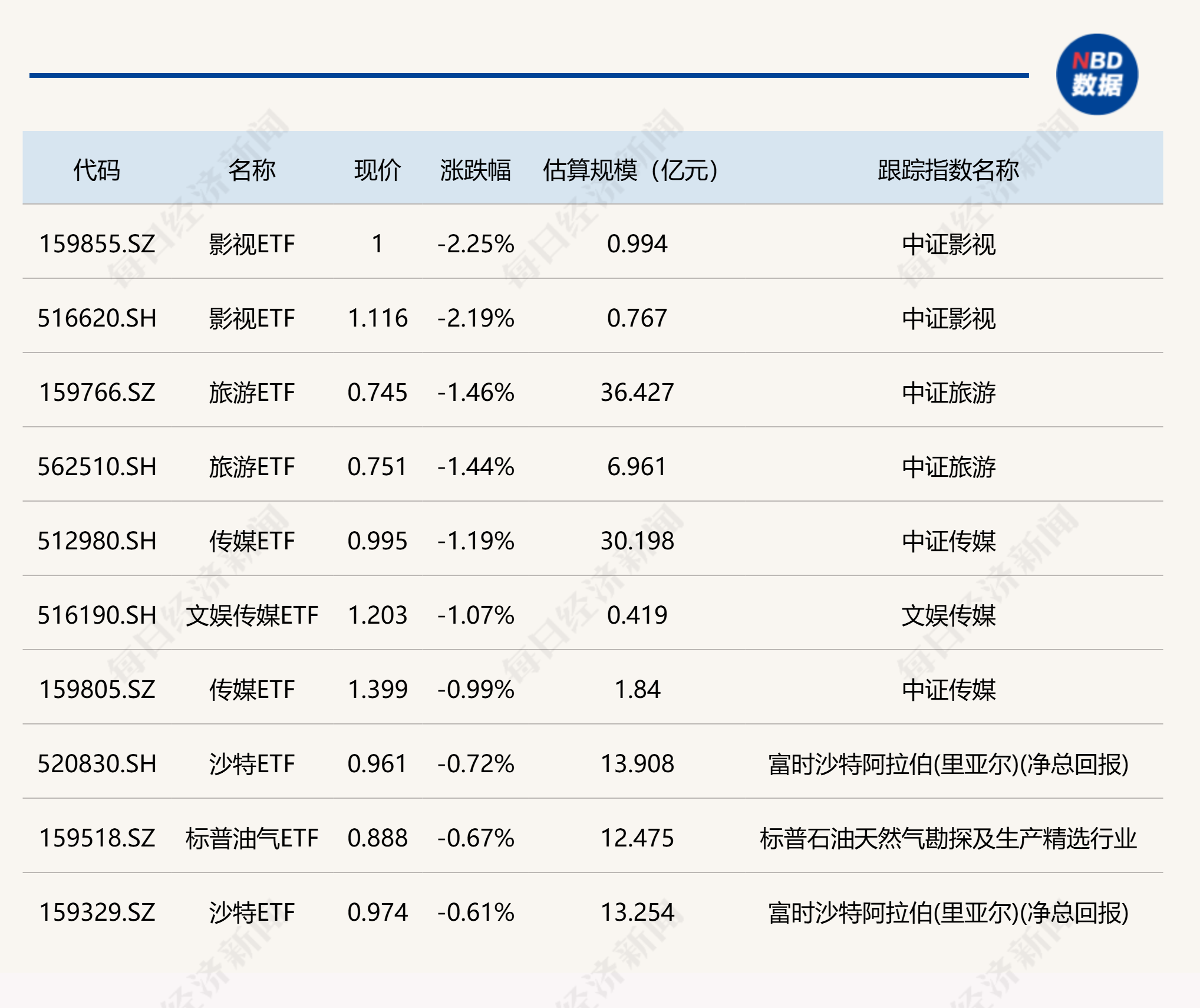 有券商表示,随着AI模型的迭代,AI应用的商业模式越来越清晰。Sora2.0的发布在技术升级的同时引入社交属性,为Open AI拓宽了商业变现渠道,同时社交属性会为AI应用的用户数量进一步赋能,进而对上游算力基础设施建设提出了更高的要求。Open AI率先锁下三星、SK海力士、AMD的存储、GPU等相关订单,意味着AI基建需求增长的确定性进一步强化,相关算力产业链有望在未来趋势中受益。 下跌方面,影视ETF跌超2%。