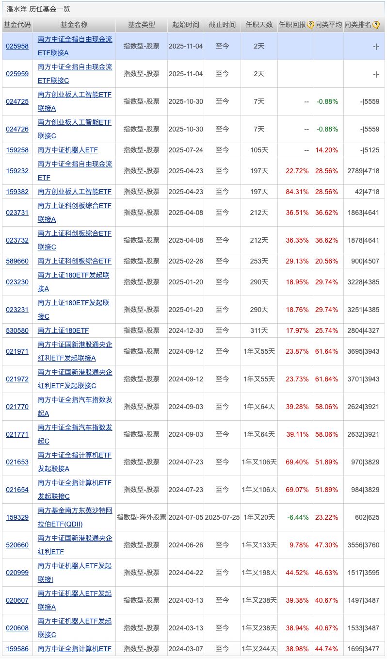 2、ETF主题机会 在当前严峻的外部环境倒逼下,中国半导体产业正以“集体冲锋”姿态开启自主化突围,全国各地在2025年10月迎来一波覆盖全链条的半导体项目落地热潮。山东德州通过激光雷达项目实现了从材料到整机的“垂直一体化”生产,旨在打破国外垄断,实现核心芯片的自主可控。郑州、蚌埠和厦门则分别在大尺寸硅片、MEMS传感器和高端模拟芯片等领域布局,共同致力于填补国内空白、提升自给率并加快国产化替代。可关注半导体产业ETF等产品。 四、明日重点关注新发基金1、基金简称:南方中证全指自由现金流ETF联接 基金类型:ETF联接基金 基金经理:潘水洋 业绩比较基准:中证全指自由现金流指数收益率×95%+银行活期存款利率(税后)×5% 基金经理部分过往业绩: