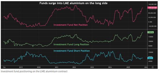 来源:市场资讯 来源:金十数据 过去几个月,大量资金涌入伦敦金属交易所(LME)铝合约,投资者押注该市场长期供应过剩的日子即将结束。 投资者累积了创纪录的多头头寸,推动铝价实现六连涨,本周LME三个月期铝价格突破2900美元/吨,为2022年5月以来首次。 这场投机性资金流入,标志着铝市场叙事逻辑的转变。 作为全球最大铝生产国,中国的产量如今已触及政策红线,市场对铝市场可能将面临数十年来首轮结构性供应短缺的担忧日益加剧。 尽管上周LME库存单日激增10.2275万吨,但就铝市场的一贯情况而言,LME库存变动可能极具迷惑性,因此上述说法或许并不突兀。 基金转向看涨 仅在六个月内,伦敦铝合约的投资基金净持仓已从中性彻底转向全面看涨。 集体净多头头寸突破13万张,为2022年初以来首次——当时俄乌冲突爆发后,LME铝价一度飙升至4073.50美元/吨的历史高点。 未平仓多头合约(相当于近500万吨铝)达到198744张,是LME自2018年2月首次发布持仓报告以来,规模最大的看涨押注。 空头头寸则从4月的逾10万张降至6.8233万张,进一步放大了净持仓的转向幅度。