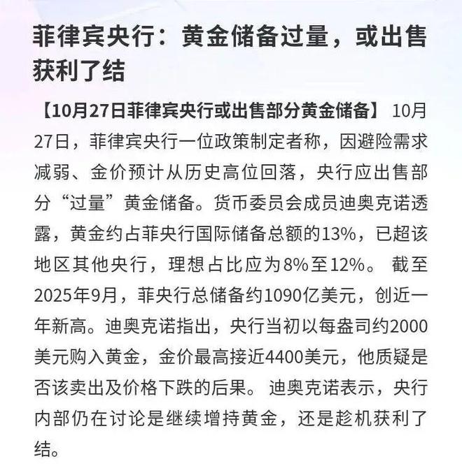 有朋友看到这要说了:不就是存个黄金吗,这有啥好关注的? 话可不能这么讲。 虽然新闻很不起眼,都没有上热搜,但其背后的意义却是非常重大。 咱们照例还是掰开了揉碎了,从头开始说。 随着美元的持续走弱,美元信用体系的瓦解,以及对于地缘政治风险的担忧,世界各国的央行都在积极增加黄金储备。 再叠加上市场上的一些炒作情绪,这直接就导致了黄金价格在上个月一度突破了4350美元每盎司。 当然,世界各国的央行他们购买的并不是炒作出来的纸黄金,而是实实在在,看得见摸得着的纯度99.5%以上,全球通用的LBMA标准金条。 可是买到金条之后,你不可能说全都运回国内,不光有安全性的问题,这里面还有运输成本,更重要的,这对于国际交易结算来说太不方便了。 就比如说,菲律宾央行前段时间看到金价太高了,本国黄金储备过量,准备出售一部分获利了结。