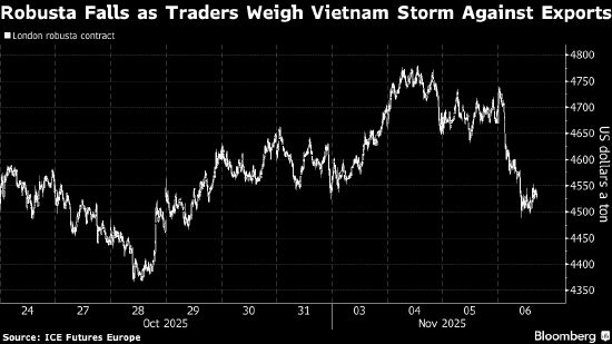 伦敦罗布斯塔咖啡期货下跌,交易员权衡全球最大罗布斯塔咖啡豆生产国越南的强劲出口量与预计将席卷该国主要产区的台风影响。 最活跃合约一度下跌4.2%,至每吨4489美元,因越南海关最终数据显示,该国10月咖啡出口量同比激增约55%。随着台风海鸥逼近越南,这场风暴将在该国主要咖啡产区带来暴雨,可能损害作物。 越南2025-26年度咖啡采收于上月启动,中部的暴雨可能损毁植株、延误采收并影响豆质。但Sucafina气象策略师Greg Oddo指出,这一情况预计不会显著改变整体供应前景,因为较高的价格将激励农民收集掉落的咖啡果实。 价格: 伦敦罗布斯塔咖啡下跌3.1%,至每吨4,540美元。纽约时间10:49,阿拉比卡咖啡下跌2.4%。 可可期货在纽约下跌2.7%,在伦敦下跌2.9%。 |