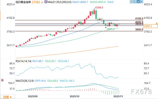 由于美国政府持续停摆,黄金的下行风险仍得到了一定程度的缓解。这种政治僵局引发了投资者对潜在经济后果的担忧,也在黄金价格经历多日强劲上涨后对其造成了负面影响。 全球股市隔夜表现涨跌互现。美国股指预计在纽约交易时段小幅高开。 隔夜重要新闻 美国最高法院对特朗普关税提案持怀疑态度。周三,美国最高法院就特朗普关税政策展开听证,法官们提出大量质疑,暗示可能会介入此事。 受关税影响并寻求解决方案的企业和国家,将面临数月的不确定性。无论最高法院是否判定特朗普援引1977年《国际紧急经济权力法》对数十个国家征收关税的行为违法,事实是特朗普总统青睐关税政策。 贸易律师和专家表示,若有需要,他仍可借助其他多项法律填补空白,即便这些法律都无法提供特朗普所看重的即时性。”“这意味着,美国与中国、欧盟及其他贸易伙伴的重大地缘政治谈判,以及数千家缴纳关税或试图规避关税的企业的日常运营,都将笼罩在不确定性之下。 周三晚间的博彩市场显示,特朗普胜诉的概率下降,美国大型零售品牌股价上涨,市场寄望于今年他征收的进口税能有所减免。”经过周三两个半小时的庭审,关键保守派大法官对政府的辩护提出质疑,特朗普政府仍表现出乐观态度。 特朗普表示,有人告诉他庭审“进展顺利”,并警告称,若他未能对贸易伙伴的商品征收关税,“整个世界都将陷入萧条”。彭博社报道称,特朗普表示,“这是我国历史上最重要的案件之一,或许就是最重要的那起。” 美国高流量机场航班将削减10%。由于美国政府停摆,为缓解空中交通管制人员和航空系统的压力,美国运输部和联邦航空管理局将在40个高流量市场削减10%的航班运力。削减将分阶段进行,美国航空公司需在周五削减4%的航班量,周六削减5%,并在下周某个时间点达到10%的削减幅度。国际航班不受影响。 运输部长肖恩·达菲表示,削减航班是维护航空旅行安全的必要举措,“数据将决定我们的行动”,若数据走势不佳,可能会实施额外限制。这一消息可能会给美国议员们带来更大压力,促使联邦政府恢复运作。 沙特阿拉伯将原油价格降至11个月低点。在石油输出国组织及其合作伙伴(OPEC+)暗示明年初暂停增产、采取谨慎态度几天后,沙特阿拉伯将12月销往亚洲的主要原油品级价格降至11个月来最低水平。 沙特国家石油公司(沙特阿美)将其旗舰产品阿拉伯轻质原油的价格每桶下调1.20美元,较区域基准价溢价1美元。此前,炼油企业和交易商的调查显示,市场预计沙特阿美将降价1.25美元/桶。彭博社报道称,沙特阿拉伯及其他部分OPEC+主要成员国周日表示,在12月小幅增产之后,将于第一季度暂停增产,以在争夺市场份额与应对潜在供应过剩迹象之间寻求平衡。此次暂停增产恰逢季节性需求疲软期,同时市场正密切关注美国对俄罗斯两大石油生产商实施制裁后对供应的影响。 美国10月裁员人数创22年来同期新高,人工智能为主要原因。根据裁员咨询公司挑战者、格雷和克里斯马斯公司的数据,随着人工智能重塑行业且企业成本削减提速,美国企业10月宣布的裁员人数创下20多年来同期最高纪录。上月美国企业宣布裁员153,074人,几乎是去年同期的三倍,主要集中在科技和仓储行业。 该公司首席营收官安迪·挑战者表示,这是自2003年以来10月的最高裁员数据,当时手机的出现也带来了类似的行业变革。挑战者在报告中称,“部分行业在疫情期间的招聘热潮后正进行调整,但与此同时,人工智能的应用、消费者和企业支出放缓以及成本上升,正推动企业紧缩开支并冻结招聘。目前被裁员工更难快速找到新工作,这可能会进一步放松劳动力市场。” 今年以来,美国裁员人数已超过100万,为疫情以来最高水平。同期,美国雇主宣布的招聘计划数量为2011年以来最少。截至10月的季节性招聘计划则创下2012年该公司开始追踪相关数据以来的最低值。 今日关键外部市场动态:美元指数走低,原油价格走强,交易于每桶60.00美元左右。基准10年期美国国债收益率目前为4.14%。 技术分析