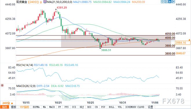 汇通财经讯——金价在尝试站稳4000美元关口未果后小幅走低。美国政府长期停摆背景下,投资者保持谨慎,为避险资产提供支撑。市场注意力转向当日晚些时候多位美联储官员的讲话,以获取货币政策新动向。 汇通财经APP讯——周四(11月6日)美盘时段,现货黄金在美元走弱的背景下短暂收复4000美元心理关口后小幅走低。金价盘中交投于3985美元左右,较日内高点4019美元有所回落,涨势陷入停滞。