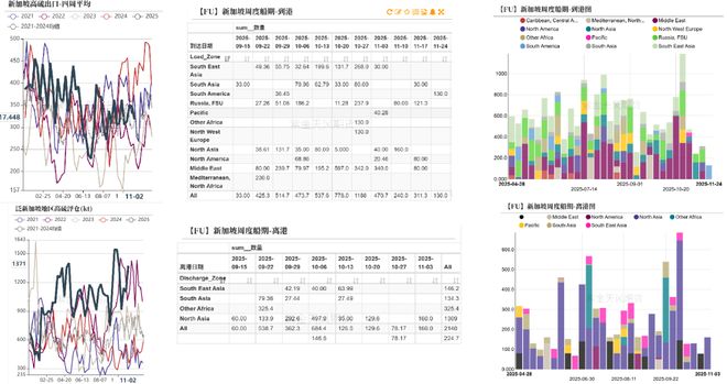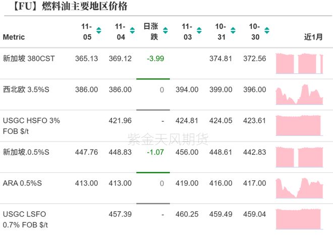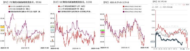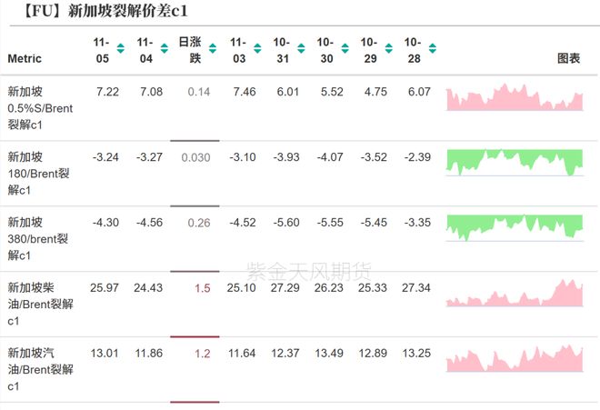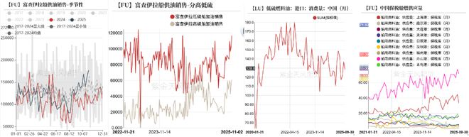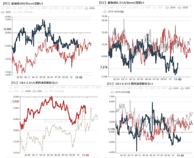 来源:市场资讯 (来源:油市小蓝莓) 【20251106】燃料油周报:低硫供应预期收缩 核心观点:中性近期燃料油主要矛盾在地缘端。美国和欧盟加大对俄石油和天然气制裁引发市场恐慌性溢价导致油价飙升,燃料油价格跟涨,但情绪过后影响有限;俄罗斯炼厂遇袭,供应不稳定,市场担忧仍在;高硫燃料油贴水下行,现货低价成交。中东燃油发电旺季已过,出口回升;需求方面,船燃和二次进料需求保持稳定,发电需求旺季已过。新加坡库存反弹。山东原油配额下半年不够用,Q4或增加燃料油进口。高硫市场结构保持坚挺,后续上涨空间有限,强现实和弱预期矛盾显现。近期关注Lu-Fu价差做阔机会,炼厂检修装置回归情况以及出口情况。 裂差:中性 10月欧美收紧对俄制裁引发市场对俄罗斯供应收紧担忧带动高硫裂解大涨,后续情绪消退,裂差回归。当前裂差已处季节性高位,不宜过分看好四季度裂差。 供应:中性 亚洲炼厂秋检并未显著收缩供应,中东燃烧发电旺季过去出口增加,拉美出口下降。 需求:中性 发电需求接近尾声,船燃需求向好。 库存:中性 新加坡燃料油库存充足 风险 地缘冲突、宏观扰动 低硫燃料油观点小结 核心观点:中性偏多10月美国收紧对俄制裁引发油价大涨带动燃料油跟涨,Opec+决定26年一季度暂停增产,科威特AI-zour炼厂因火灾而停产检修,重启时间推迟;Dangote炼厂因RFCC装置检修完毕在10月提前回归,预计后续LSSR发货量减少,市场传言国内低硫出口配额部分转换成成品油出口配额,低硫供应预期收紧,Lu价格抬升,内外窗口打开;后续或增加进口对价格上行形成阻力。关注低硫燃料油船期及配额转换情况,关注Lu-Fu价差做阔机会。 裂差:中性偏多市场对低硫供应有收缩预期,低硫裂差震荡走强,海外低硫裂解也低位回升。 供应:偏多科威特AI-Zour炼厂 ARDS部分装置发生火灾而停产,国内低硫出口配额或部分转换给成品油,供应减量。 需求:中性高硫加注替代效应增强,低硫下游需求无明显驱动。 库存:中性 新加坡低硫燃料油库存和到货充裕。 风险 地缘冲突、宏观扰动 核心逻辑 高硫燃料油供给:遇袭,制裁,检修下的俄炼厂出口量环比减少