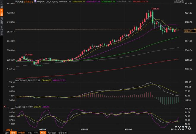 汇通财经讯——周四早盘金价一度强势拉升近1%,直逼4020美元/盎司关口,却在纽约时段戛然而止,全线回吐涨幅,最终收于3976.85美元/盎司,几乎与前一交易日持平。一方面,避险资金蜂拥而入,推动金价短暂上扬;另一方面,美股全线暴跌的拖累效应,让投资者转向现金避险 汇通财经APP讯——周五(11月7日)亚市早盘,现货黄金震荡微涨,目前交投于3984美元/盎司附近。周四金价上演了一出“冲高回落”的惊险大戏,早盘一度强势拉升近1%,直逼4020美元/盎司关口,最高触及3919.44美元/盎司的亮眼高点,却在纽约时段戛然而止,全线回吐涨幅,最终收于3976.85美元/盎司,几乎与前一交易日持平。这波震荡行情是美国政府史上最长停摆、特朗普关税政策合法性疑云笼罩,以及疲软劳动力市场数据等多重不确定性交织而成的结果。一方面,避险资金蜂拥而入,推动金价短暂上扬;另一方面,美股全线暴跌的拖累效应,让投资者转向现金避险,黄金的辉煌瞬间化为泡影。面对这一幕,市场不禁发问:在美联储降息预期升温的背景下,黄金的年底冲刺还能否重拾涨势?