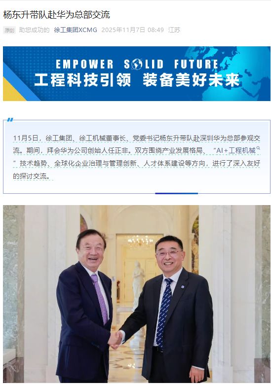 每经编辑|杜宇 据徐工集团官方微信号11月7日消息,11月5日,徐工集团、徐工机械董事长、党委书记杨东升带队赴深圳华为总部参观交流。期间,拜会华为公司创始人任正非。双方围绕产业发展格局、“AI+工程机械”技术趋势、全球化企业治理与管理创新、人才体系建设等方向,进行了深入友好的探讨交流。