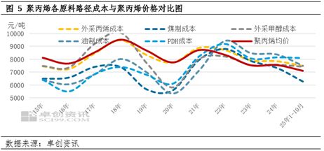 备注;图4中蓝色线反映聚丙烯近10年的季节性价格变化规律:100% 线上方表示当月均价环比上涨,且位置越高涨幅越大;100%线下方则表示当月均价环比下跌,且位置越低跌幅越大。 三、成本下移与转嫁难题:双向挤压下的行业困局 近年来,聚丙烯市场陷入“价格下行但成本高位”的双向挤压困境。价格方面,供需宽松是核心逻辑。随着国内聚丙烯产能持续释放,供应端压力长期存在,而需求端缺乏强刺激,价格随市场规律自然下行。而成本端,以原油、丙烷为代表的核心原料自2020年起持续走高并维持高位,导致企业生产成本较2020年前大幅攀升,从2022年开始,聚丙烯主要原料路径的成本线,长期高于聚丙烯平均售价,上游生产企业持续处于亏损状态。尽管近两年成本端有所缓解,但需求疲软,供需矛盾主导下行的现状使得企业向产业链下游转嫁成本压力的难度极大。因此,即便2025年聚丙烯成本重心有所下移,上游生产企业的盈利修复仍面临较多阻碍,道路依然艰难。