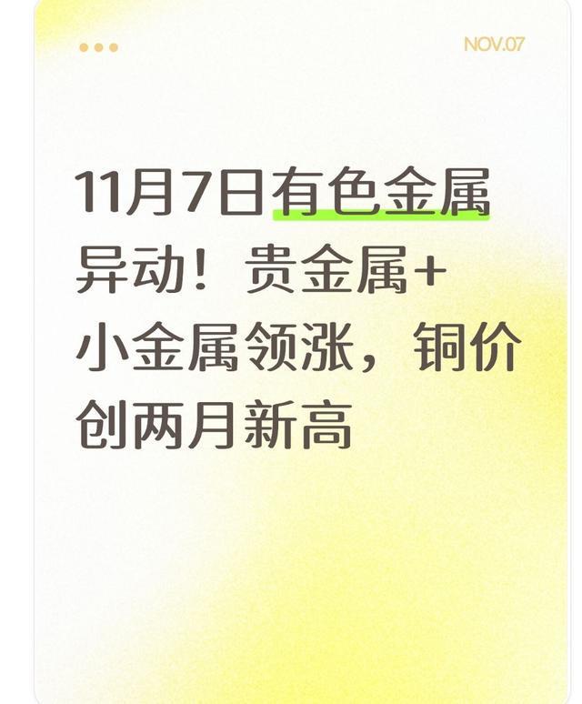 11月7日有色暴动!贵金属小金属领涨,铜价创两月新高背后逻辑曝光 11月7日,国内大宗商品市场迎来“有色金属时间”。贵金属与小金属板块率先发力领涨全场,铜价更是强势突破前期震荡区间,创下近两个月来的新高,整个有色板块呈现出多点开花的火爆行情。 这波异动绝非偶然,而是政策红利、供需失衡、市场情绪等多重因素共振的结果。咱们用实打实的数据说话,带你看清这波有色行情的来龙去脉,以及普通投资者该如何把握机会、规避风险。 先来看最直观的市场表现,11月7日早盘数据就足够亮眼。沪铜主力合约开盘后震荡上行,盘中最高触及89130元/吨,较前一交易日收盘价上涨0.47%,这一价格创下了9月中旬以来的新高,妥妥的“两月最强表现” 。现货市场上,SMM 1#电解铜报价在87550~87980元/吨之间,均价贴水60元/吨,虽然仍处于贴水状态,但较前一日下降5元/吨,贸易商和下游采购情绪已经明显回暖 。 更让人意外的是小金属的“疯狂”。被称为“工业牙齿”的钨,近期行情堪称炸裂。截至11月5日,65%黑钨精矿价格飙至31.2万元/吨,较年初直接翻倍还多,钨粉价格更是突破710元/公斤,年内涨幅高达124%。有江西的钨矿贸易商直言,干这行十几年,头一次见这种“报价再高也拿不到货”的情况,持货商宁愿囤着也不愿轻易出手。 贵金属板块也不甘示弱,黄金现货价格站稳917元/克关口,较前一周上涨1.2%;白银价格单日上涨1.91%,突破5800元/千克,创下一个月来的新高。除了领涨的品种,其他有色品种也多数跟涨,铝价上涨70元/吨,锌价上涨70元/吨,镍价上涨170元/吨,锡价更是大涨320元/吨,不锈钢、螺纹钢等关联品种也小幅走强,整个有色产业链呈现出“一荣俱荣”的态势。 成交量数据同样能印证市场的热度。11月7日早盘,沪铜主力合约成交量突破28万手,成交额超250亿元;钨相关概念股盘中异动,中钨高新直线拉升,章源钨业、厦门钨业等跟涨明显,资金涌入迹象十分突出。这种量价齐升的格局,说明市场对有色板块的上涨预期已经形成共识,并非单纯的短期炒作。 要搞懂这波有色行情的核心逻辑,首先得看政策层面的强力支撑。就在10月中旬,工业和信息化部、自然资源部、商务部等八部门联合印发了《有色金属行业稳增长工作方案(2025-2026年)》,这可是行业发展的“定海神针” 。 方案明确提出,2025-2026年有色金属行业增加值年均增长5%左右,十种有色金属产量年均增长1.5%左右,再生金属产量要突破2000万吨。更关键的是,方案重点提及要加强铜、铝、锂、镍、钴、锡、钨等关键资源的调查与勘探,实施新一轮找矿突破战略行动,这直接给这些品种的长期价值定了调 。 不仅如此,政策还支持低品位、共伴生资源的绿色开采技术攻关,鼓励“人工智能+有色金属”行动,推进节能减污降碳改造,这些举措既保障了资源供给的稳定性,又提升了行业的发展质量,让资本市场看到了有色行业的长期成长空间 。 值得注意的是,自然资源部对钨矿的开采总量控制指标进行了调整,直接缩减了6.45%,江西、云南等主产区的配额大幅减少。在供给收紧的同时,需求却在爆发,光伏钨丝今年出货量同比激增40%以上,军工领域的钨制品订单也同比增长42%,供需缺口一下子就拉开了,这也是钨价暴涨的核心原因之一。 除了国内政策,全球市场的供需变化也起到了推波助澜的作用。先看铜价,矿端供应的扰动一直存在。第一量子矿业公司的Sentinel矿,虽然第三季度铜产量环比增加8228吨,达到51336吨,但全球范围内的铜矿品位下降、开采成本上升等问题依然突出,长期供给偏紧的格局没有改变 。 库存数据更能说明问题。截至10月29日,国内电解铜现货库存仅18.45万吨,虽然较前一周微增0.29万吨,但仍处于历史偏低水平 。而伦敦金属交易所(LME)的铜库存也持续低位运行,全球库存紧张的局面,让铜价具备了“易涨难跌”的基础。 需求端的复苏也不容忽视。随着国内基建项目加速落地,电网改造、新能源汽车、光伏风电等新兴产业对有色金属的需求持续增长。尤其是新能源领域,铜作为“新能源金属”,在充电桩、光伏支架、风电电缆等环节的用量巨大,而铝、镍、钴等品种更是动力电池的核心原材料,这些新兴产业的爆发式增长,给有色行业带来了源源不断的需求支撑。 全球宏观环境的变化也为有色行情添了一把火。近期中美贸易关系出现缓和迹象,市场对铜精矿等原材料的进口预期改善,缓解了供应链扰动的担忧。同时,美联储10月实施鹰派降息后,美元指数有所走弱,以美元计价的大宗商品吸引力上升,这也为贵金属和有色金属价格上涨提供了有利的外部环境。 还有一个关键因素是行业自身的转型升级。国内有色金属企业不再单纯追求产量增长,而是转向高质量发展。比如在冶炼环节,企业纷纷推进节能减污降碳改造,提高资源利用率;在产品结构上,加大超高纯金属、铜合金结构功能材料等高端产品的研发力度,这些高端产品的附加值更高,也让企业的盈利能力和市场竞争力大幅提升 。 对于当前的有色行情,市场上存在不同的观点,有人认为这是新一轮上涨周期的开始,也有人担忧短期涨幅过大可能引发回调。结合数据和行业逻辑,我谈谈自己的看法。 从长期来看,有色板块的上涨趋势是有坚实基础的。一方面,全球“碳中和”目标下,新能源、新材料等新兴产业的发展离不开有色金属,这会带来持续的增量需求;另一方面