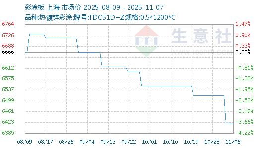 据生意社商品行情分析系统,本周彩涂板价格趋于稳定。11月3日彩涂板市场价格在6416元/吨,11月7日价格在6416元/吨,价格较上周下跌1.53%,较去年同期下跌2.787%。 二、分析评述 镀锌板:本周镀锌板的价格小幅下跌,周五(11月7日)镀锌板价格在4182元/吨,价格较上周下跌0.404%,较去年同期下跌4.67%。涂镀市场下游需求表现不温不火,市场成交偏淡。