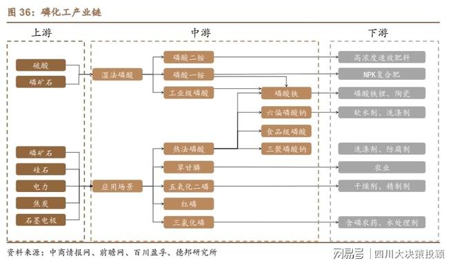 2.磷矿石位于磷化工产业链的起点 磷矿石为上游核心,下游应用丰富。磷化工产业链核心为上游磷矿石。按工艺的不同,1、磷矿石可直接制备磷酸,之后向下游延伸不同磷化物,中游主要以磷酸一铵、磷酸二铵为主,向下继续延伸则为农肥和农业生产。2、磷矿石可制备黄磷,后制备热法磷酸,向下延伸主要为草甘膦和各种磷酸盐;磷酸盐下游主要应用为工业洗涤剂、金属表面处理、工业水处理、建筑工业、医药、塑料增塑剂等 领域。