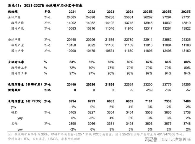 据 IFA、USGS 和百川盈孚等,25-27 年全球磷矿产能预计增加 401/947/658 万吨,我们预测海外磷矿开工率为79%/79%/80%,全球耕地面积扩张或带来磷肥年需求增长 3%,或带来 25-27 年磷矿供需缺口 289/197/57 万吨,磷矿价格有望维持 1-2 年高景气。