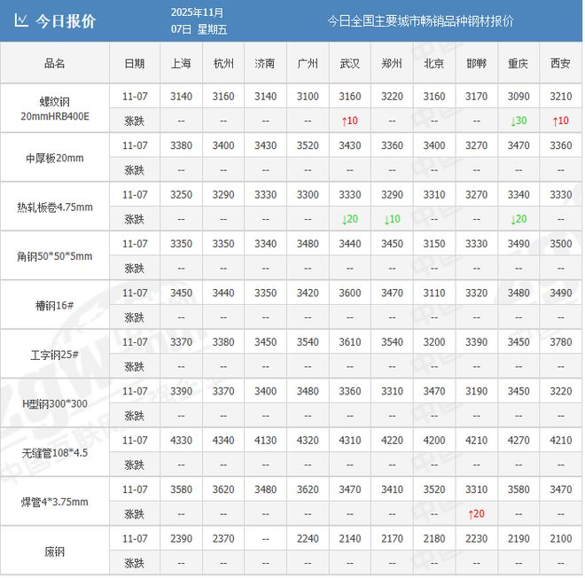 南京钢铁计划于11月上中旬对螺纹钢产线进行例行检修,为期20天,期间螺纹停产。 广东中南钢铁股份有限公司6号高炉计划从11月24日起休风检修38天,预计影响建材日均产量0.4万吨。 中天钢铁集团(南通)有限公司计划于11月20日对一台转炉进行例行检修,为期12天;计划于11月20日对1条螺纹钢产线进行例行检修,为期15天,预计影响产量待定。 福建三钢优特钢棒材生产线计划于2025年11月12日起停产检修13天,主要影响60-180mm中大规格,预计影响优特钢棒材总产量3万吨左右。 常州东方特钢计划于11月中下旬开始对一座550m³高炉进行检修,为期30天,预计影响铁水产量2000吨/天,同期对轧线轮流检修,影响轧圆总量7万吨。 现货稳中个调