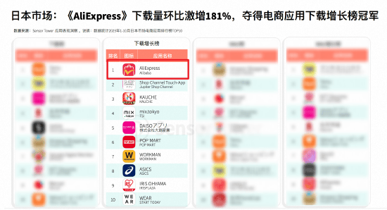 仟茂科技讯 11月7日下午消息,近日,据数据分析机构Sensor Tower 推出的《2025年购物季电商应用与品牌市场洞察》报告显示:阿里旗下的跨境电商平台速卖通AliExpress在日本应用市场下载量环比激增181%,打败KAUCHE等多个本土电商平台,拿下今年日本电商应用下载增长榜冠军。