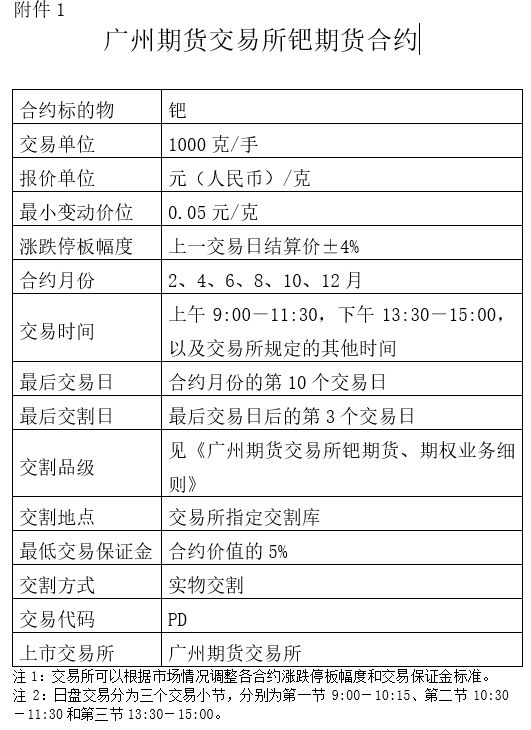 《广州期货交易所钯期货合约》《广州期货交易所钯期权合约》《广州期货交易所钯期货、期权业务细则》已由广州期货交易所董事会审议通过,并报告中国证监会,现予以发布,自发布之日起实施。钯期货和钯期权合约上市交易时间及有关事项另行通知。
