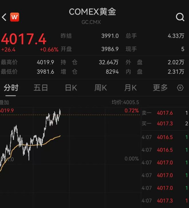 纽约期金价格报4013.1美元/盎司,日内涨0.66%。