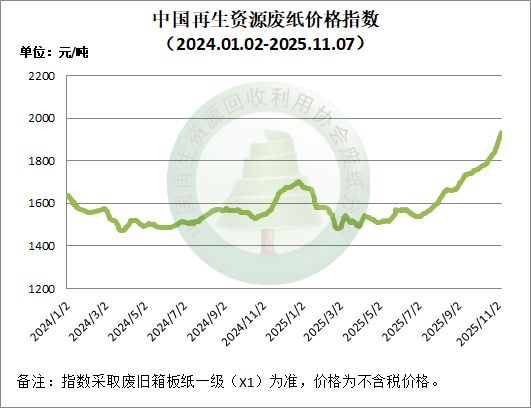 废纸信息网讯: 今日中国再生资源废纸价格指数为1933元/吨,与上一个工作日相比上调10元/吨。望当地废纸商家密切关注价格走势,谨慎操作! 今日小结: 今日,国废黄板纸价格上涨。 价格指数趋势图