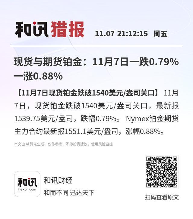 【11月7日现货铂金跌破1540美元/盎司关口】11月7日,现货铂金跌破1540美元/盎司关口,最新报1539.75美元/盎司,跌幅0.79%。Nymex铂金期货主力合约最新报1551.1美元/盎司,涨幅0.88%。