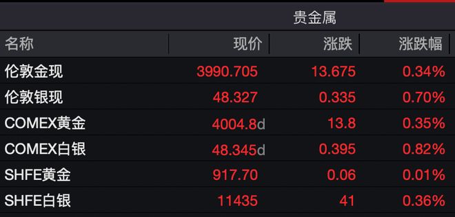 黄金表现强势。截至发稿,COMEX黄金报4004.8美元/盎司,涨幅为0.35%。COMEX白银报48.345美元/盎司,涨幅为0.82%。