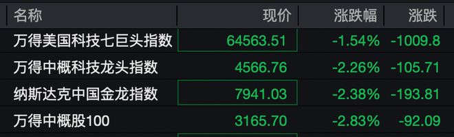 大型科技股普跌,AMD跌超2%,特斯拉、英伟达、甲骨文跌超1%。热门中概股普跌,纳斯达克中国金龙指数跌超2%。小鹏汽车跌超5%,哔哩哔哩、阿里巴巴跌超3%,京东跌超2%,理想汽车、百度跌超1%。
